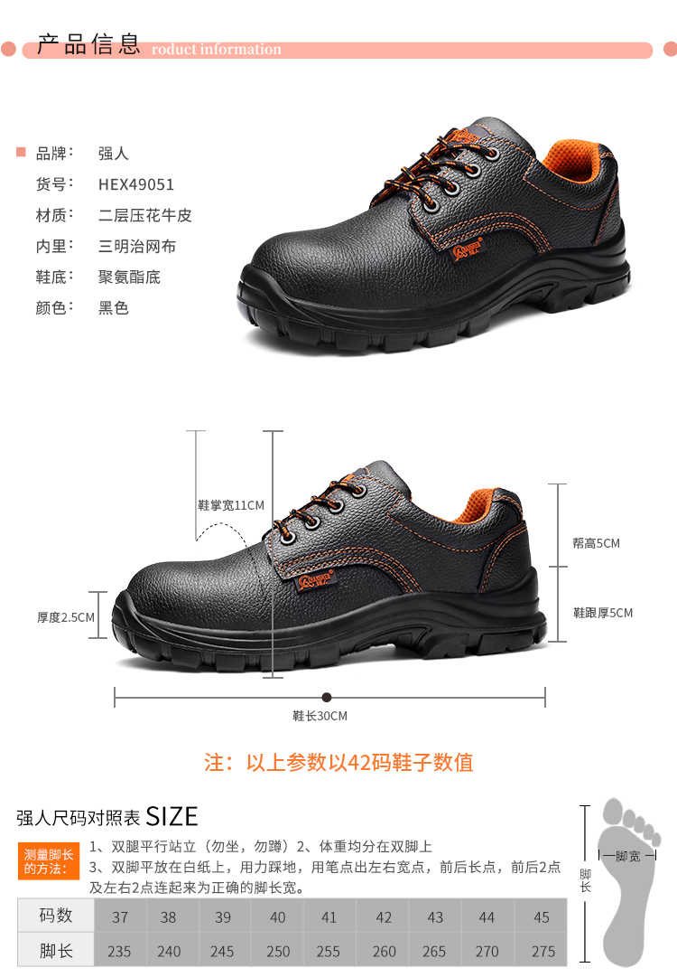 强人劳保鞋男 HEX49051 钢包头钢底防砸防穿刺防静电LA认证安全防护功能鞋透气舒适牛皮工作男鞋 黑色